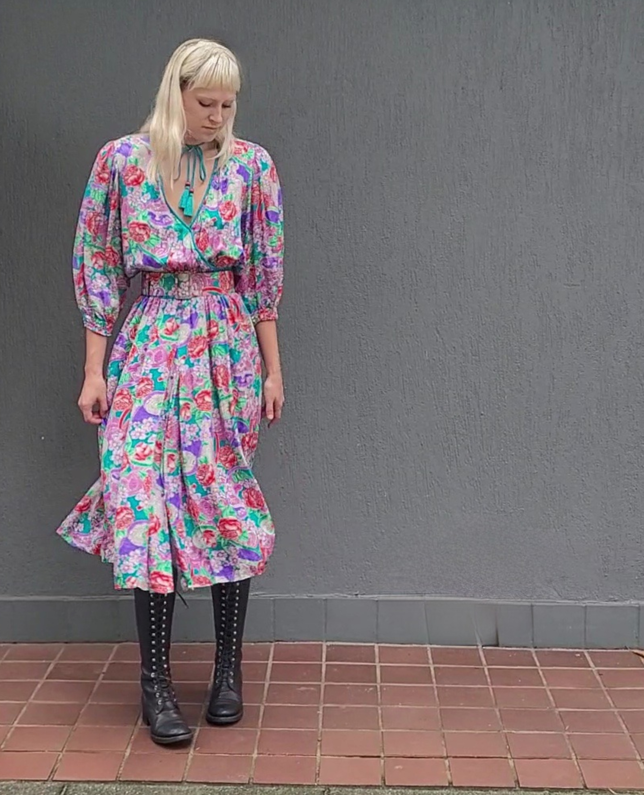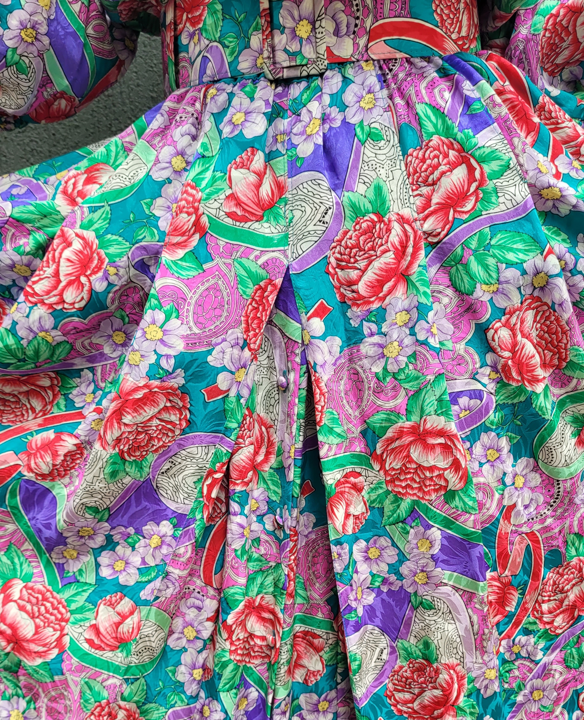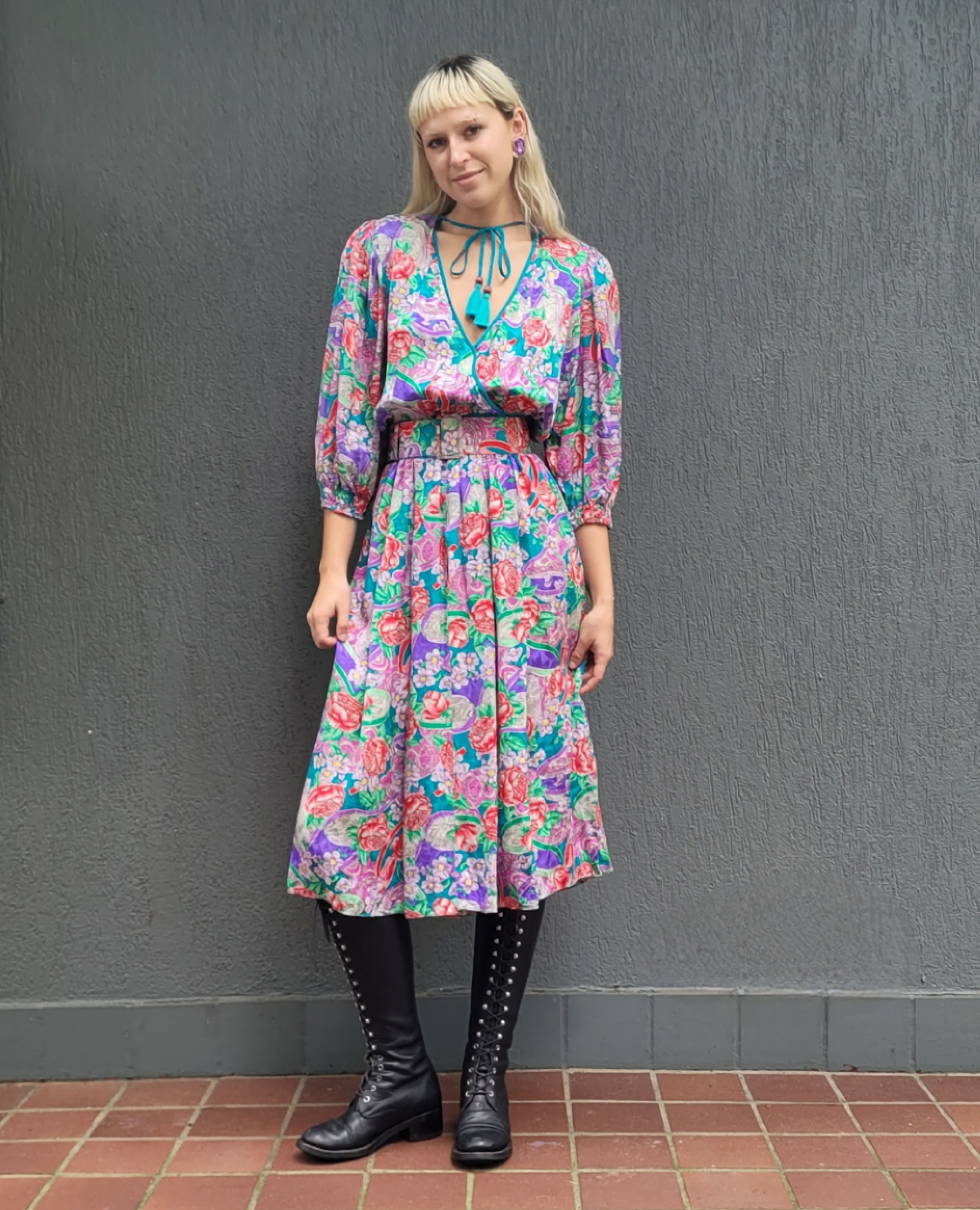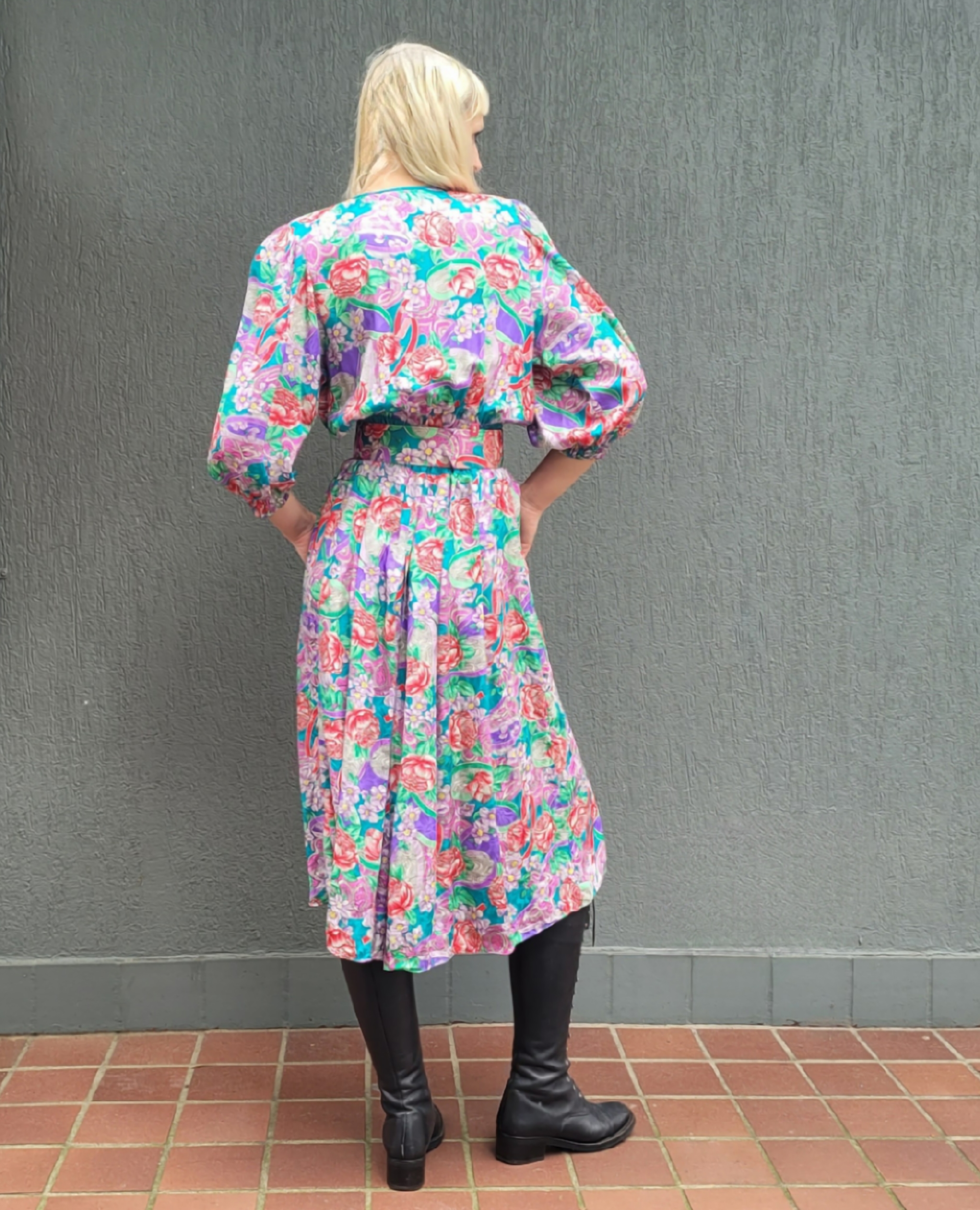 Another stunning piece from the Diane Freis Collection. Silk with matching belt, faux cross over bodice, 3/4 sleeves with shirring. Extremely full skirt with inverted pleats. It also has buttons down the front of the skirt section if you want to show a bit of leg. The matching belt is 6cm wide. Wear with or without the belt. The model is a size 8 and the dress is too big for her. Best fit 10-12au, or a tight fit 14 due to shirred waist and loose bodice and full skirt section. Shoulders pads can easily be removed as the design is a regular placement of a shoulder seam but the shoulder pad extends past the seam, so no droopy shoulders if removed. With all the signature Freis things like shirred waist, tie up tassel at neckline, full flowing skirts. Made in Hong Kong 100% silk. These dresses look amazing in motion (can you tell I’m a fan?)