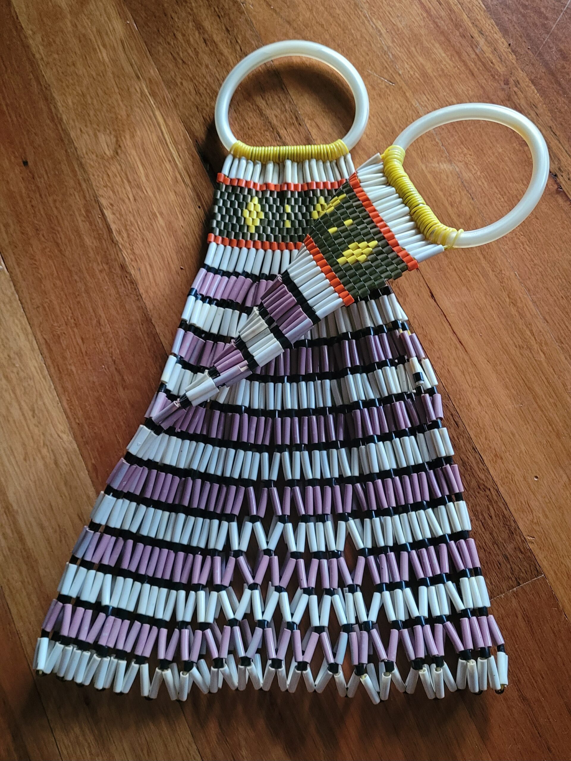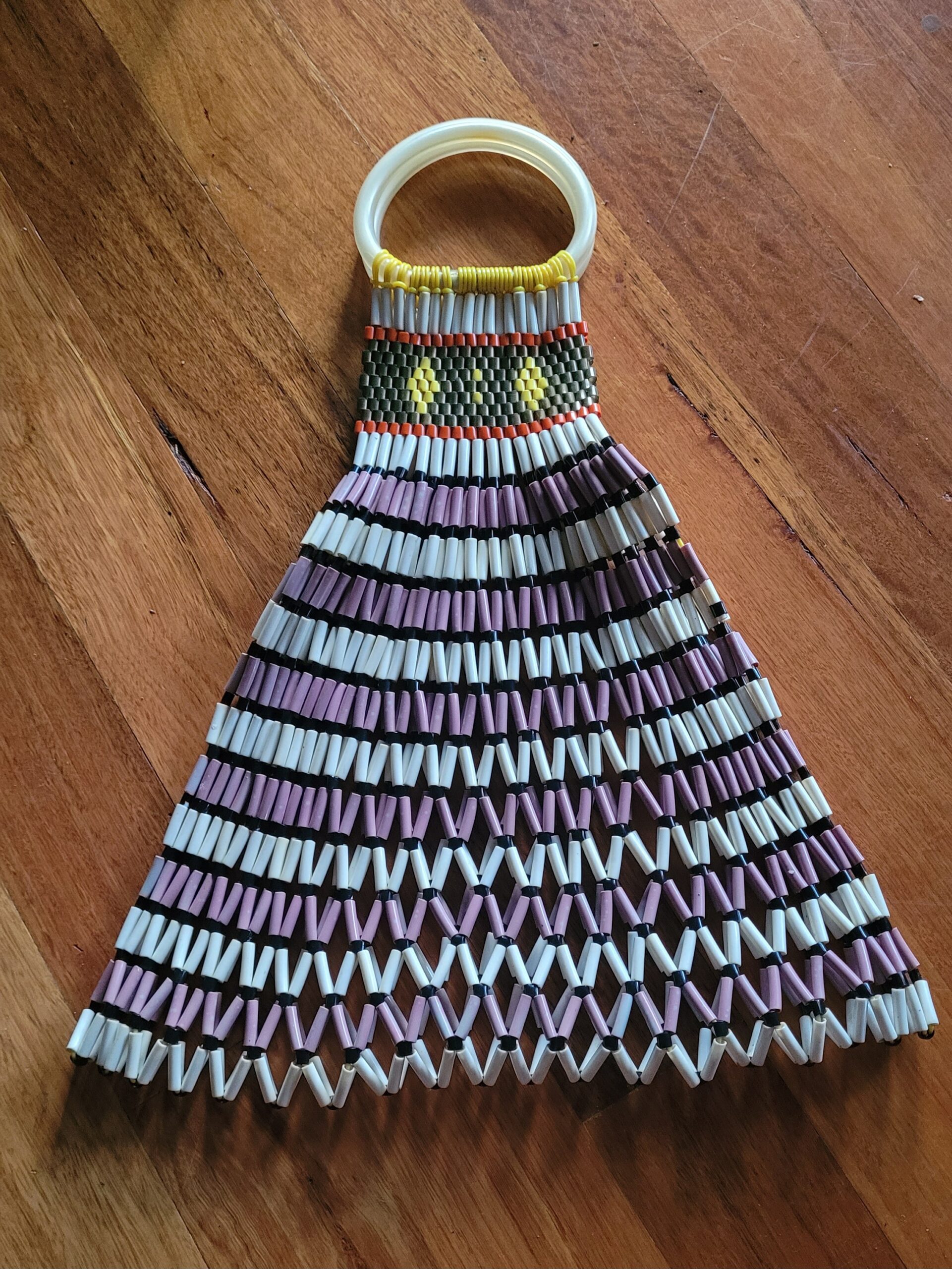 Popular in the 50s and 60s. These bags just keep on giving. This one has two handles and it expands as you put items in. No issues. It has had a bath and is ready for its new owner. Main body is mauve, grey and white. The top has red, yellow, brown and white. Measures 46cm top of handle to base of bag. The bottom is 27cm wide 47 expanded. Excellent condition.
